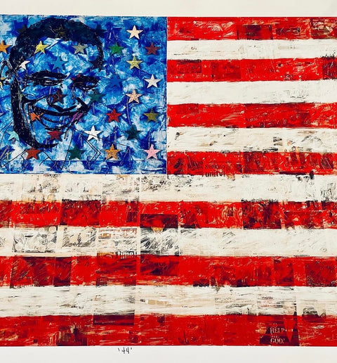 Robert Lewis Clark's monumental work 44, is a mixed-media composition of newspaper clippings on wood mounted on wood, depicts President Barack Obama and measures 11 feet wide by 8 feet high. The piece has been exhibited across Chicago, functioning as both portrait and historical document-layering media narratives, political memory, and community response into a single commanding surface.